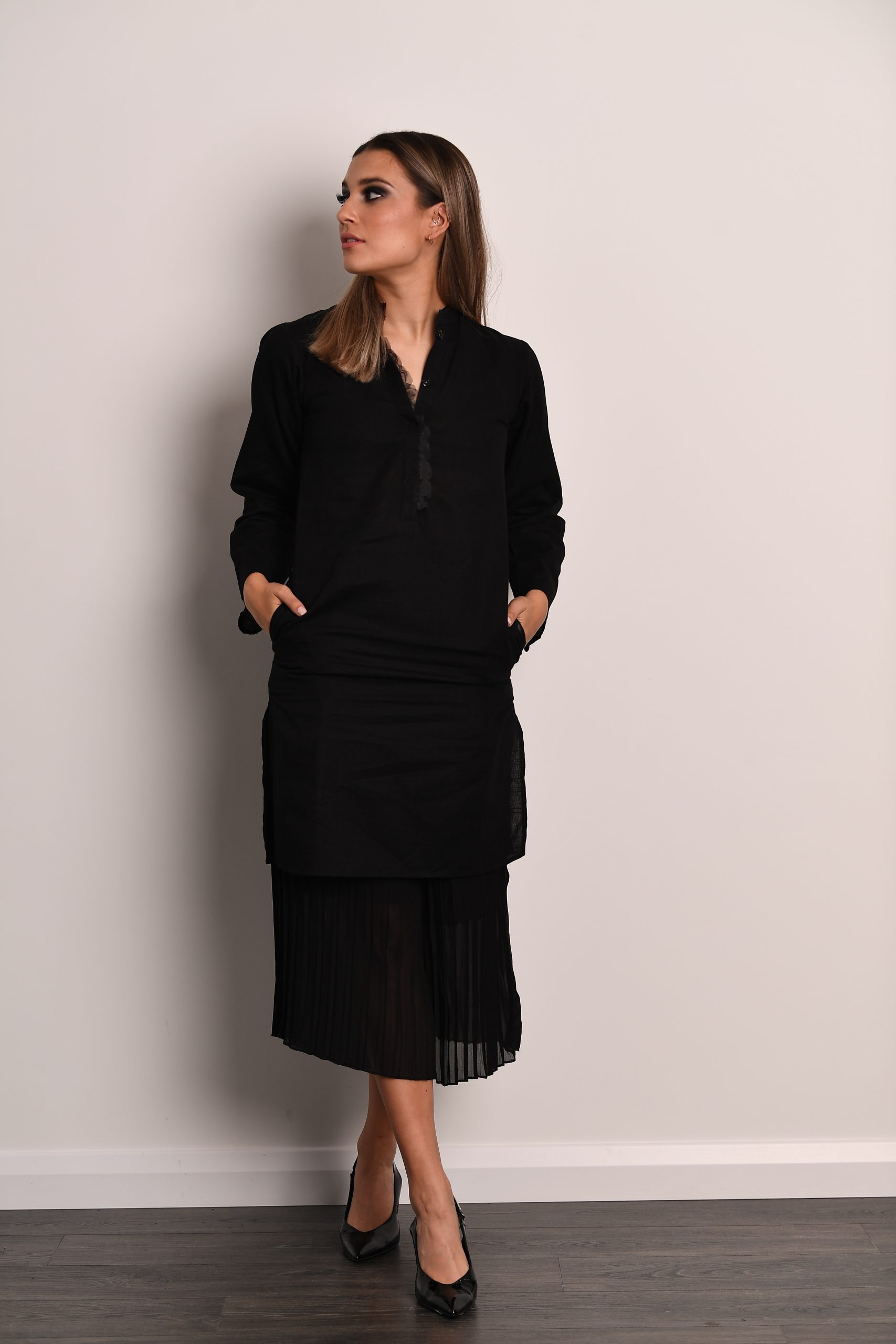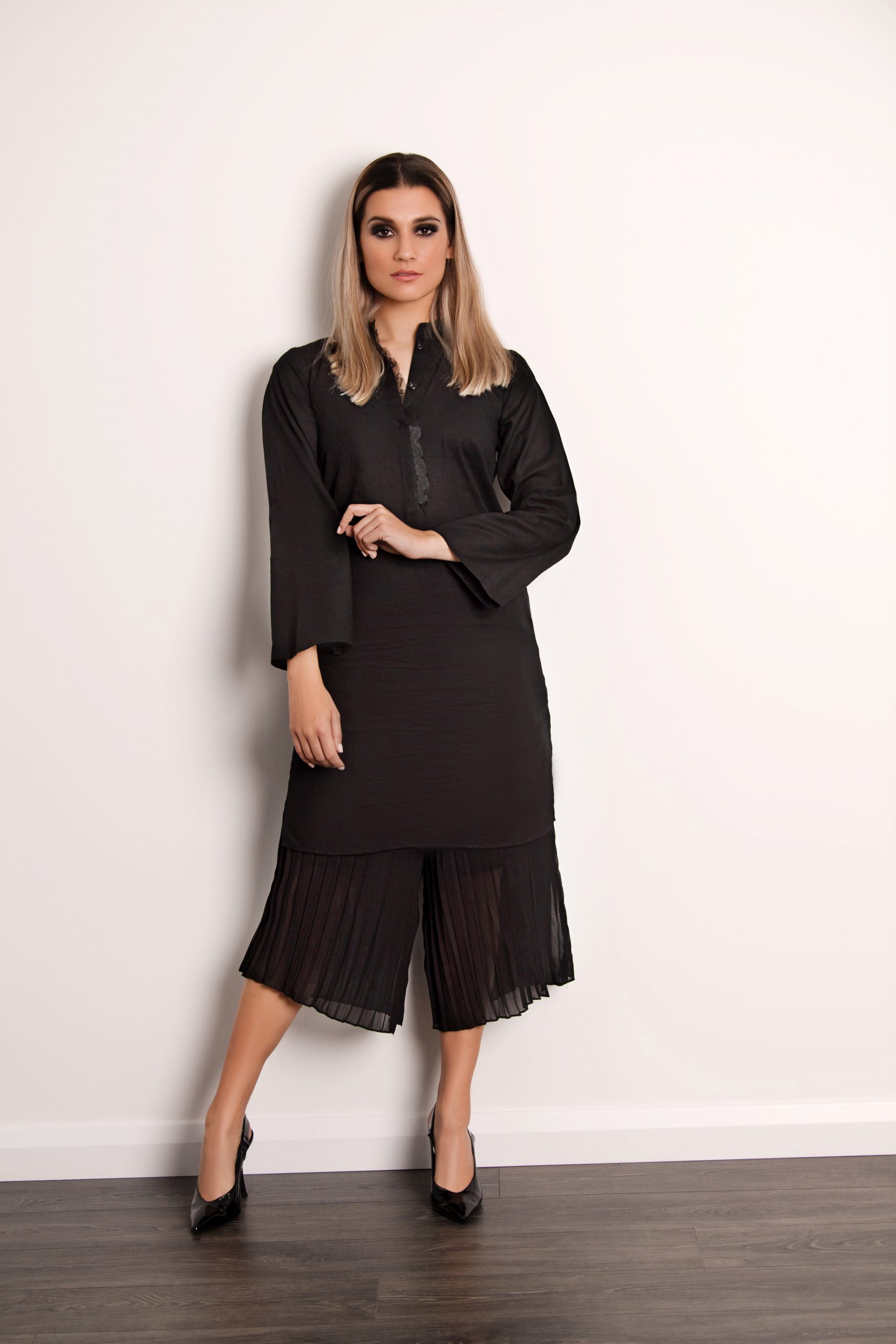This flared sleeve kurta adds an extra dimension with an invert pleat on the sleeves. Easy neckline opening with popper button opening with in seam pockets and pu leather tag detail. This modern cut kurta can be worn with pleated culottes or cropped slim leg trousers.
